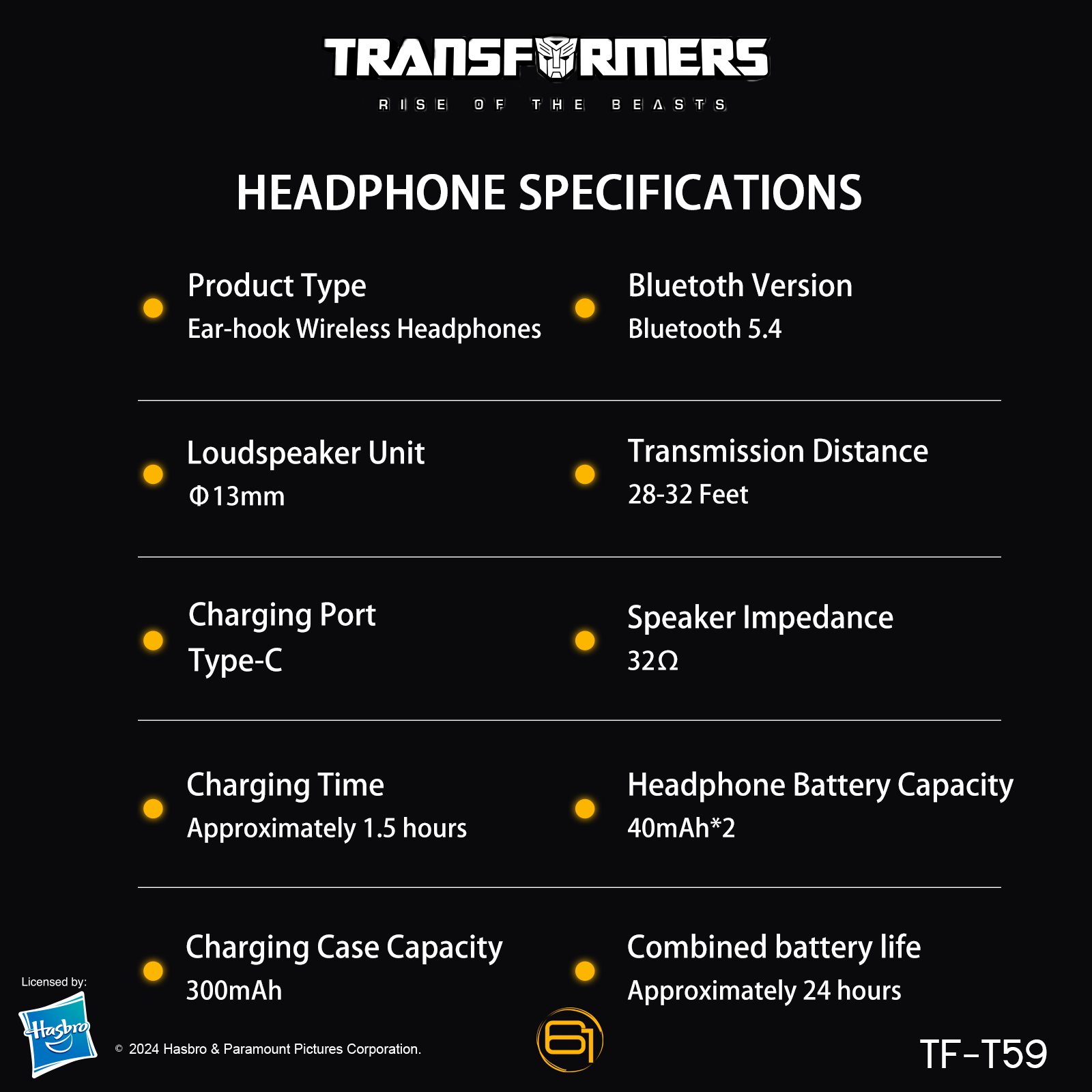 Transformers TF-T59 Ear-Hook True Wireless Bluetooth Earbuds with Mic, Low Latency Game/Music Modes, 13mm Drivers, Secure Fit Sport Headphones, IPX5 Waterproof Deep Bass Sound